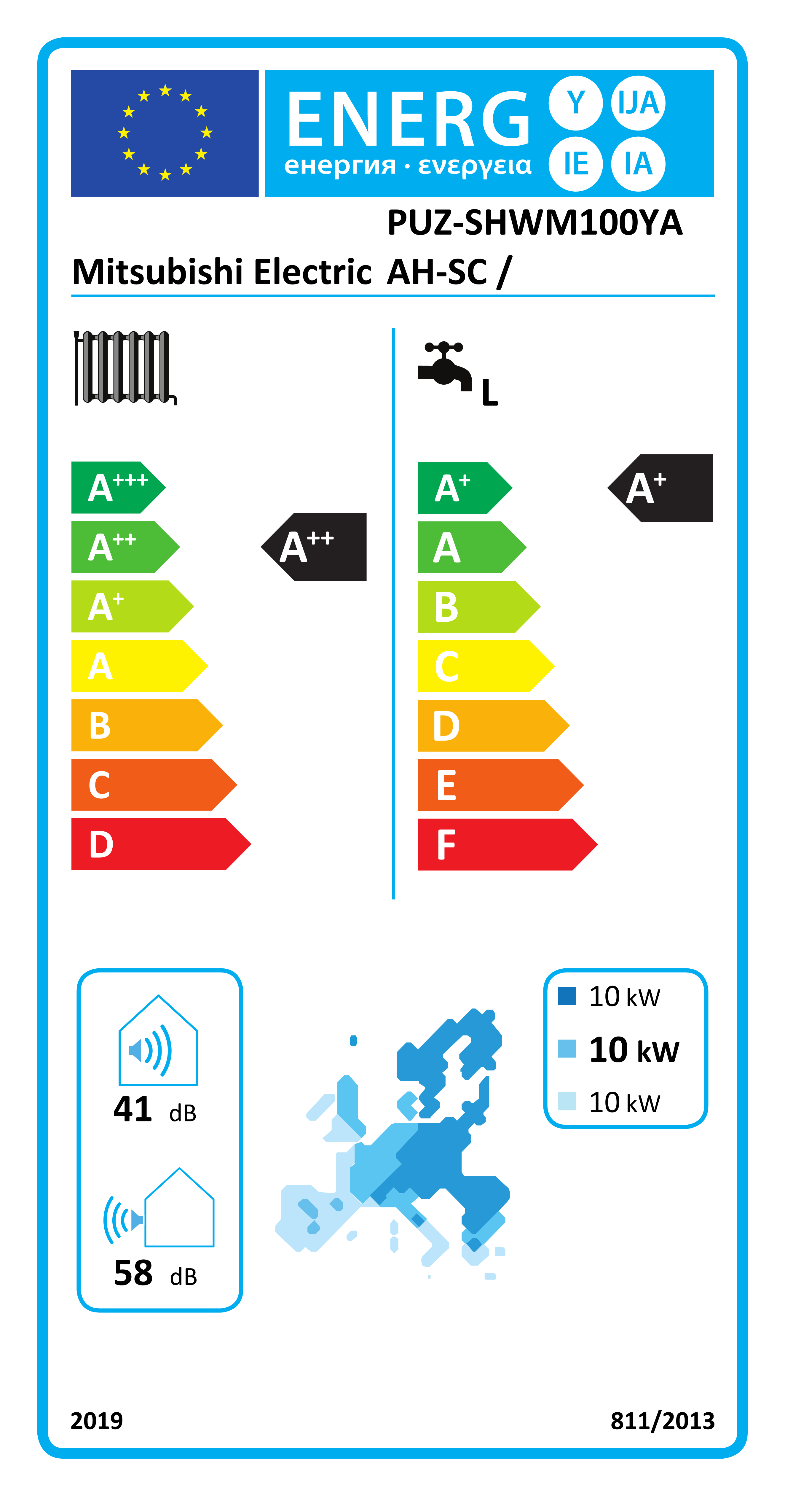 PUZ-SHWM100YAAH-SC ERST20F-YM9E har ett SCOP på 3,7 vid golvvärme och 2,9 vid radiatorvärme och ett Pdesign-värde (dimensionerad effekt) på 10,0 kW. PUZ finns även i storlekarna 8,00 kW, 8,00 kW, 10,00 kW, 12,00 kW, 12,00 kW och 14,00 kW.