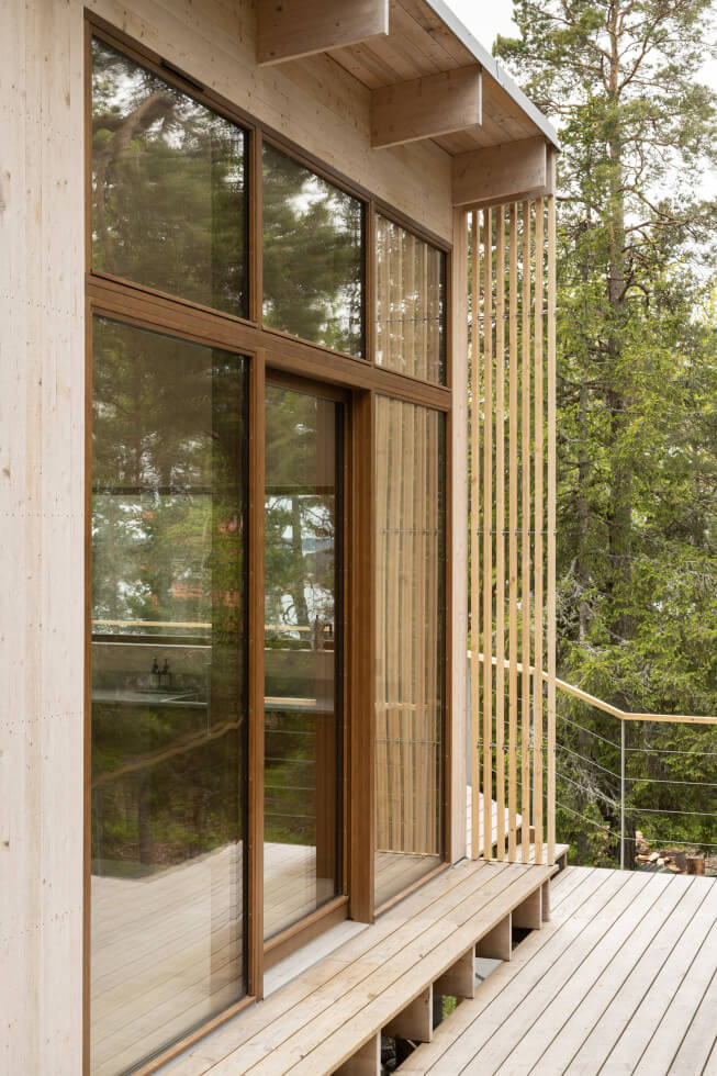 Villa Vy är lågmält med en tydlig karaktär. Huset känns betydligt större än sina 115 kvadratmeter boyta tack vare den rikliga uppglasningen och det geometriskt precisa utförandet. Den noggrant genomförda fönsterindelning ger vida utblickar över Saxarfjärden och den karga skärgårdsnaturen.