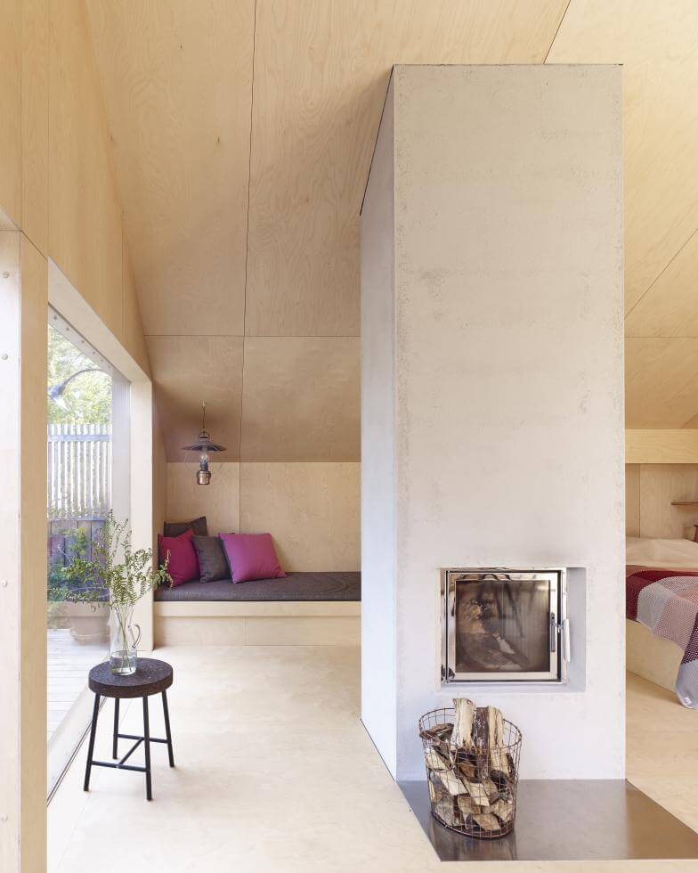 Formplywoodens tuffa ytterfasad bryts upp när de ladugårdsinspirerade dörrpartierna slås upp och den inre björkplywooden lyser igenom. Istället för att på traditionellt manér med glaspartier från golv till tak har Tove Fogelström med just rörelsen mellan husen lyckats effektiv förbinda ute och inne.